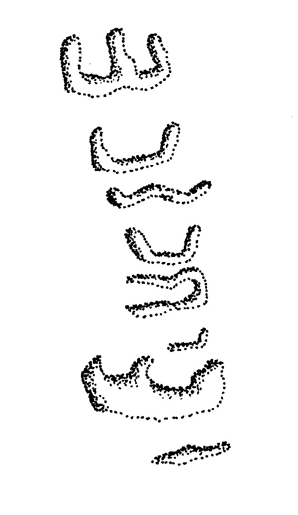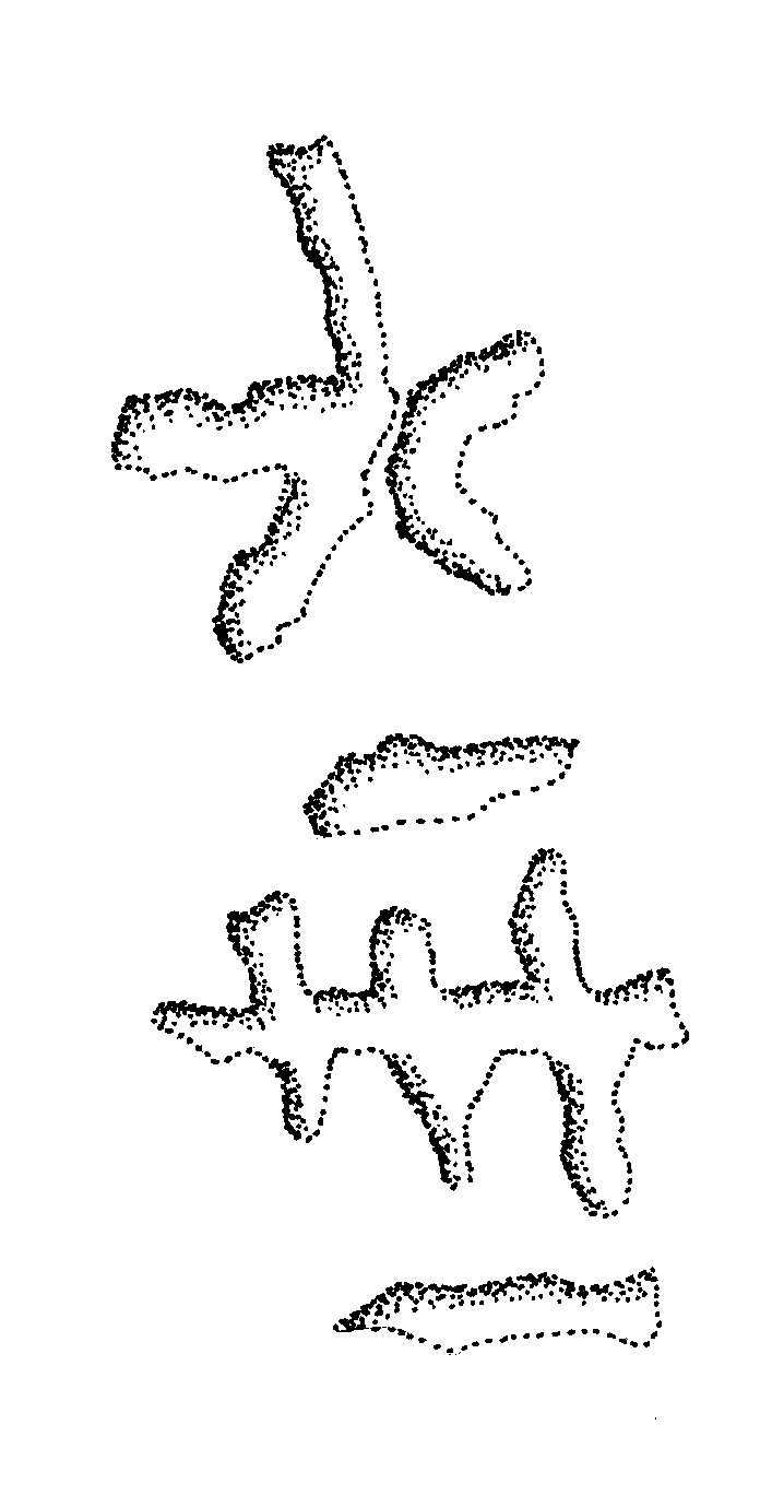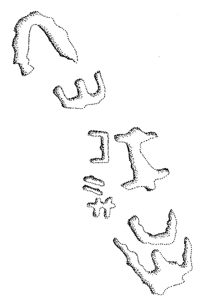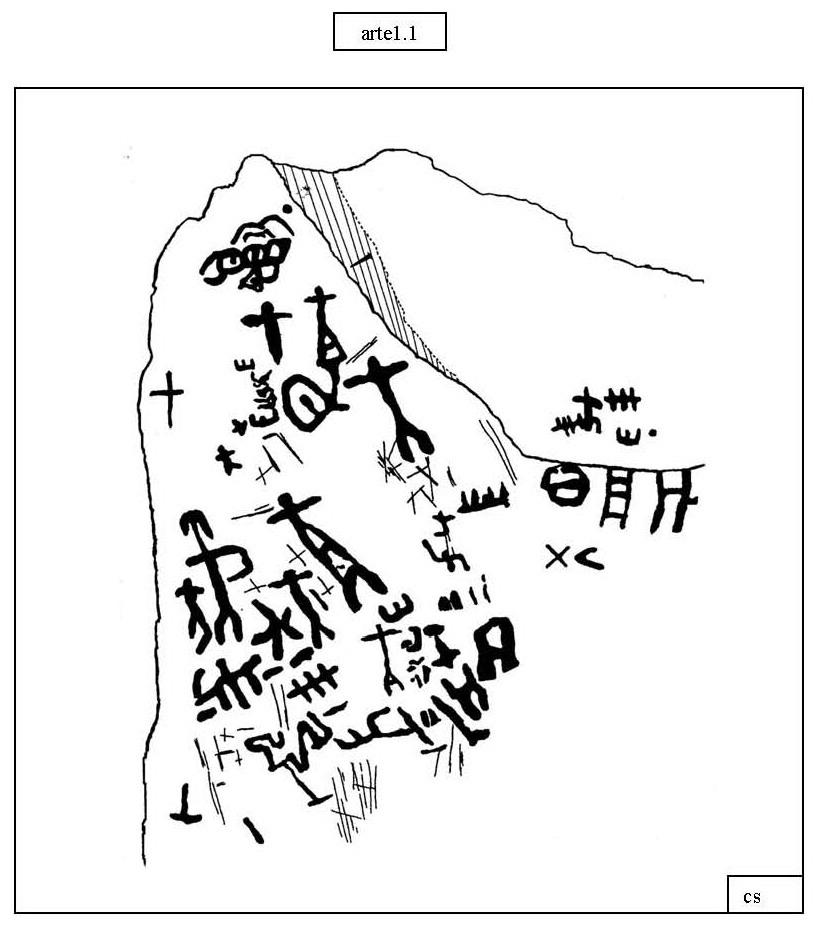 " Los alfabetiformes aparecen dispersos en el panel, estando en su mayoría asociados entre ellos, formando complejos ideogramas." |