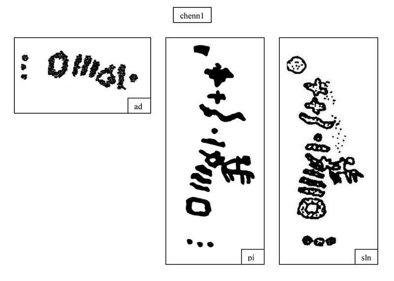 Sign 4 is mixed up by the head of a horse. As the patina is totally identical the superimposition cannot be clarified. By no means it can be identified as a "lying" sign for G (as proposed by Skounti et al. 2003:103) |