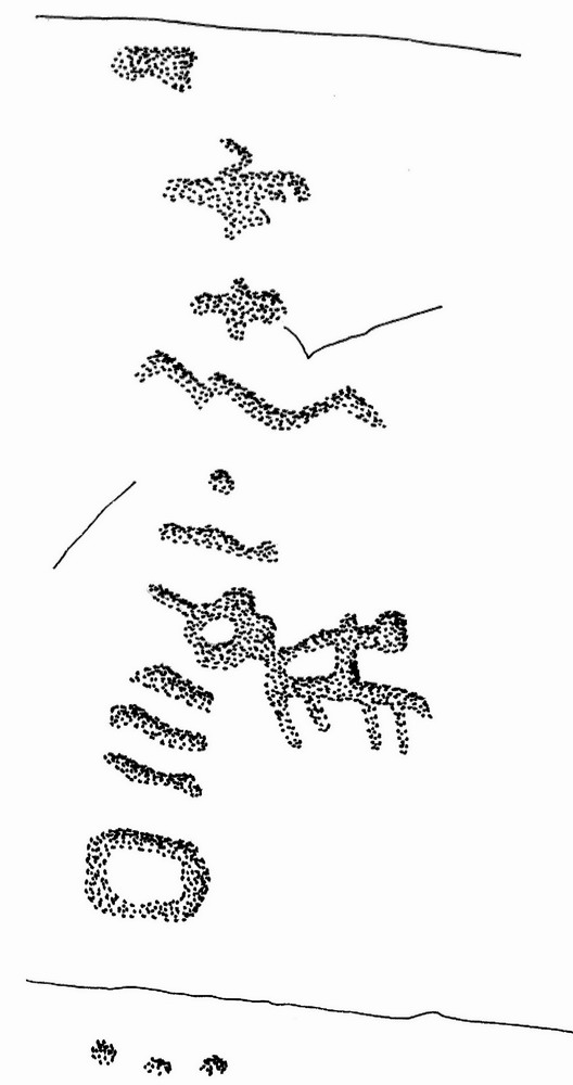 "Le caractère touchant la tête de l'animal semble être . Voilà un exemple de superposition permettant une sériation relative entre les inscriptions et les figurations rupestres associées. Dans ce cas, il est clair que l'inscription est antérieure au cavalier, du moins dans l'ordre de l'exécution puisque la patine des deux ensembles ne diffère pas nettement. Les trois points en bas de la ligne sont assez isolés du reste des caractères. S'agit-il d'une ligne qui a été interrompue pour commencer une autre ou s'agit-il seulement d'une estimation erronée de l'espace scripturaire par le lapicide?" |