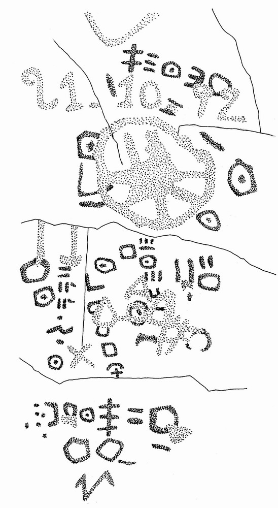 "Au moins cinq lignes dont deux horizontales, deux verticales et une en boustrophédon, associées à des roues de char de patine claire et d'autres de patine foncée identique à celle de l'inscription, plusieurs cercles, parfois avec des points à l'intérieur, des graffiti etc."
