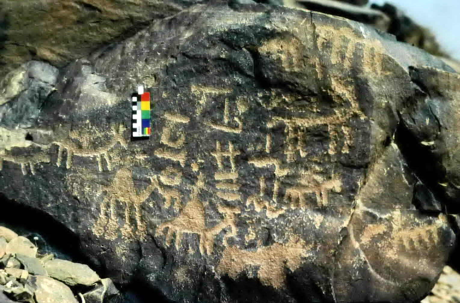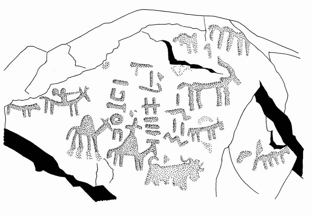 "Le panneau illustre parfaitement le cas d'association que certains linguistes n'arrivent pas à admettre entre les inscriptions et les figurations rupestres environnantes. Ici le champ scripturaire et celui des figurations constituent une entité parfaitement homogène. Si leur contemporanéité est quasi ceraine, rien ne prouve, par contre, une quelconque relation, sémantique soit-elle, entre les deux. L'inscription pose également le problème des caractères discriminant dans la détermination de l'orientation. C'est le cas ici du caractère . Il est gravé dans deux positions diamétralement opposées. S'agit-il d'un même caractère dont l'orientation est insignifiante ou de deux caractères différents?" |