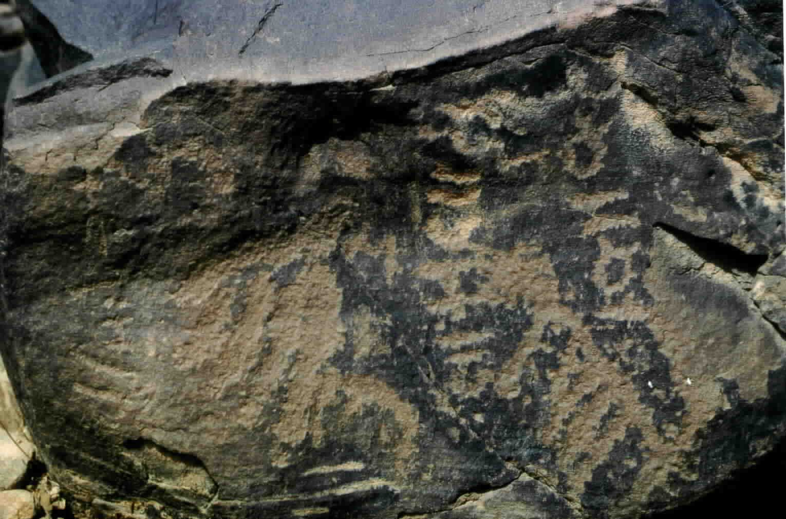 "Les deux lignes associées au quadrupède sont orientées de Bas en Haut à en juger par le sens de l'ouverture des caractères discriminants. Elles sont en plus d'un trait et d'une patine assez différents de ceux de la troisième ligne isolée. Le sens de l'orientation de celle-ci est difficile à déterminer. Le deuxième et le troisième caractère (de Haut en Bas) sont gravés dans deux positions différente. Ils ont probablement deux valeurs distinctes" |