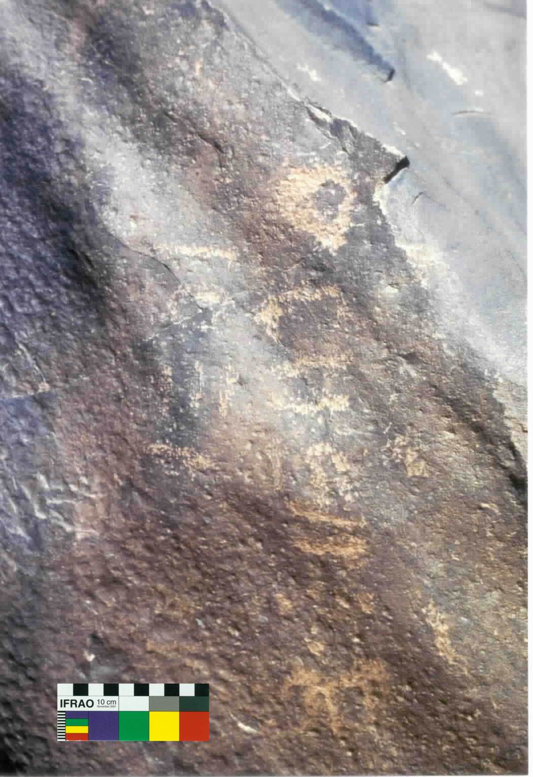 "C'est l'une des deux seules inscriptions de Foum Chenna qui continnent le caractère . Par ailleurs, on relève dans ce site plusieurs lignes qui renferment, souvent au milieu, le caractère gravé en très petites dimensions par rapport à celles des autres caractères comme c'est le cas ici dans la ligne à droite" |