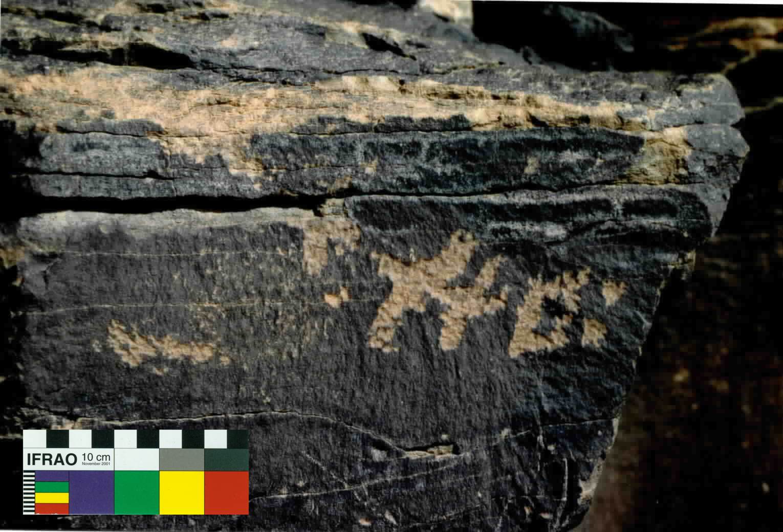 "L'inscription rappelle le jeu touareg qui consiste à écrire un même caractère plusieurs fois sur le sable, la solution de l'énigme étant de déchiffrer la séquence en ajoutant les voyelles adéquates. La ligne à gauche reprend dans l'ordre (de D à G) les quatre premiers caractères de la ligne oblique" |