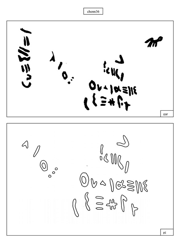 LBI-DATABASE INSCRIPTION DETAILS LBI Code CHEN1_36 Inscription name CHENNA 1_36 Terminology & Specifications Site CHEN1 Country/Island Morocco Position (geogr.) Position (UTM) Elevation 960 Direction Inclination Technique pecked Line width Line depth Context on panel Context on site various depictions of the "Libyco-Berber type", inscriptions Superimpositions no Direction of writing Lines Type of rock boulder Deposition quartzit Conformation of rock Natural defacement very light patina, identic with iconic depictions Vandalism no Archaeological context dry-rock buildings Special conditions Further comments very near to an old path through the valley Date of discovery Glory 1952 References Glory et al. 1952:717/Fig.7 right-> Reference details Epigraphic comment Transliteration Transcription Translation Comment Nearby inscriptions CHEN1_1CHEN1_2CHEN1_3CHEN1_4CHEN1_5CHEN1_6CHEN1_7CHEN1_8CHEN1_9CHEN1_10CHEN1_11CHEN1_12CHEN1_13CHEN1_14CHEN1_15CHEN1_16CHEN1_17CHEN1_18CHEN1_19CHEN1_20CHEN1_21CHEN1_22CHEN1_23CHEN1_24CHEN1_25CHEN1_26CHEN1_27CHEN1_28CHEN1_29CHEN1_30CHEN1_31CHEN1_32CHEN1_33CHEN1_34CHEN1_35CHEN1_37CHEN1_38CHEN1_39CHEN1_40CHEN1_41CHEN1_42CHEN1_43CHEN1_44 Pictures and/or drawings Fig. 1: Earlier documentations Fig. 1: Reference details gl: Glory, A.; Allain, Ch.; Reine, M. (1952): Les gravures libyco-berbères du Haut-Draa. Actes de IIe Congres Panafricain de Préhistoire, Alger, 715-722 -> More LBI-References Author and copyright © by Werner Pichler 2007 Terminology & Specifications