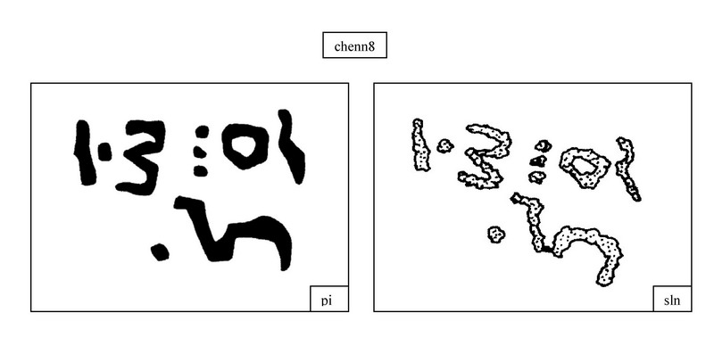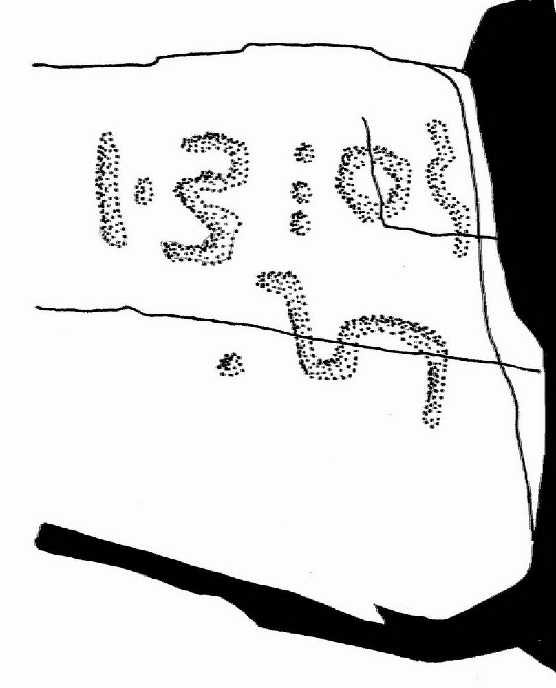 "La ligne à gauche semble avoir une orientation DG (la seule de tout le corpus de Foum Chenna) à en juger par le sens de l'ouverture du signe . En bas de cette ligne, le lapicide a gravé une figure indéterminée qu'on a presque prise pour une ligne de signes" |